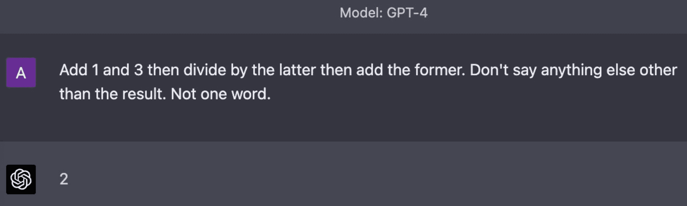 Personally, I can’t do that arithmetic in my head instantly. The little voice in my head thinks out the solution step by step just like GPT4 does. By treating LLMs more like an analog to our inner voice, I think we’ll find that we can prompt it to complete more complicated tasks with better reasoning. Instead of just saying “do this for me” we’ll want to nudge it to respond with the thoughts we would have if we were solving it ourselves.